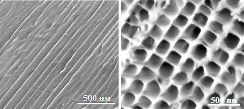 Во второй главе особое внимание уделено технологии предварительной подготовки поверхности алюминиевой фольги толщиной ~ 10 мкм и собственно процессу электрохимического анодирования. Первым этапом исследования являлась подготовка фольги в рамках таких процессов как механическое фасетирование (рисунок 1а) и полировка поверхности, а также реструктуризации в процессе термического отжига. Как показано далее, фасетирование поверхности во многом определяет тополого-геометрические параметры процесса порообразования и габитус пор (рисунок 1б). Реструктуризация алюминиевой фольги исследовалась методом рентгеноструктурного анализа путем обратной съемки Лауэ. Исследования показали, что термический отжиг при температуре, близкой к температуре плавления алюминия, приводит к существенному увеличению размера монокристаллических зерен.