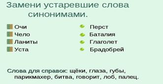 Дети изучают понятие «устаревшие слова», учиться самостоятельно их отличать. Базу знаний о таких словах составляет: определение данного слова, причина, по которой оно устарело, варианты отражения в толковых словарях, и какая роль им отводится в литературе.
