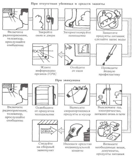 Войдя в помещение, следует снять с себя верхнюю одежду и обувь, положив их в пластиковый пакет или пленку, немедленно закрыть окна, двери и вентиляционные отверстия, включить радиоприемник, телевизор и занять место вдали от окон и быть готовым к приему информации и указаний о действиях.