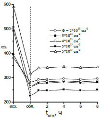 после облучения и частично восстанавливается после отжига в течение 1-8 ч, но