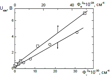 где Uкэн.о= 0,2 ÷0,4 В - величина напряжения насыщения до облучения, Кu= 1,3∙10 -25В∙см4 или 1,4∙10-31 В∙см4 - коэффициенты его радиационного изменения при воздействии электронов или гамма-квантов соответственно.