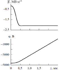 E и потенциала ϕ, рассчитанные для электронов с энергией 1 МэВ без