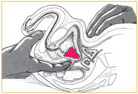Пальпацию выполняют под наркозом при опорожненном мочевом пузыре через прямую кишку у мужчин и влагалище у женщин, другая рука врача располагается над лоном. При выполнении бимануальной пальпации мочевого пузыря очень важно добиться полного расслабления мышц.