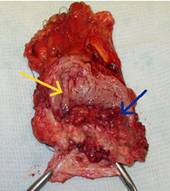 слизистая - желтая стрелка, опухоль - синяя стрелка)