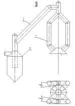 Каждая ветвь состоит из вертикальных и наклонных участков газоотводов, образующих в пределах колошникового устройства вертикальную раму (рис. 1), которая заканчивается свечой и соединяется с пылеуловителями с помощью наклонных газоотводов. В случае применения пылеуловителей с радиальным или тангенциальным вводом требуется более низкое расположение наклонных газоотводов, поэтому они отходят от середины вертикальной рамы (первый вариант сети газоотводов).
