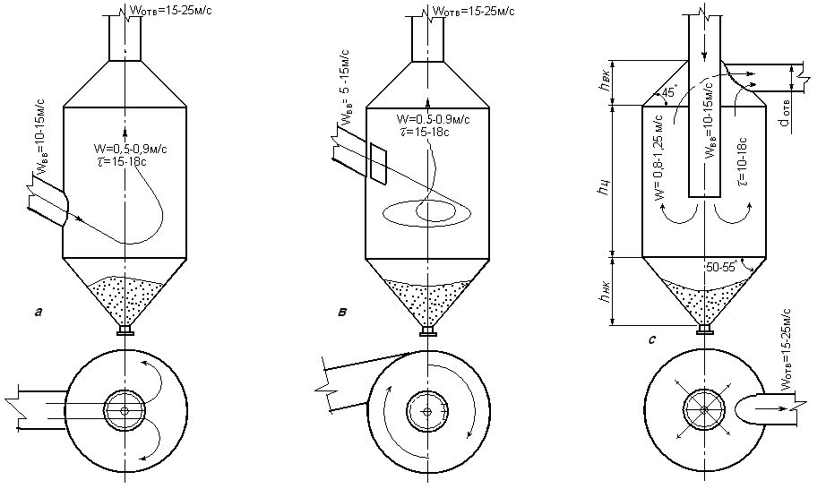 Работа агрегатов для очистки газа характеризуется коэффициентом осаждения пыли (), равным отношению количества уловленной пыли к количеству её в газе до очистки. Величина её в сухих пылеуловителях зависит от конструкции их, крупности выносимой пыли и составляет 0,5 – 0,8. Меньшие значения (0,5-0,6) характерны для пылеуловителей с центральным (осевым) вводом, большие (0,7-0,8) для пылеуловителей с тангенциальным подводом газа. Однако первые получили широкое распространение как более удобные в конструктивном отношении.