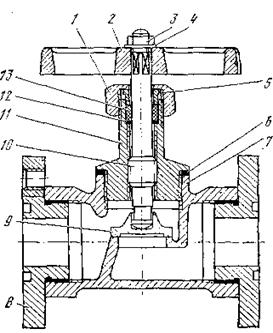 сальника; 6 - прокладка; 7 - корпус; 8 - фланец; 9 - золотник; 10 - шпиндель;