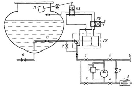 трубопровод для наполнения и опорожнения; ГК - гидроклапан; П - поплавок; КЗ -