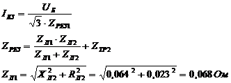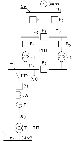 Согласно указанной на схеме нагрузки был выбран трансформатор ТДНС 10000/35 мощностью 15МВА. Для точек К1 иК2 были рассчитаны токи К.З., которые составили для точки К1 IКЗ=14,45кА, для точки К2 IКЗ=12,4кА. По условиям протекания токов К.З. на стороне 6кВ ГПП были выбраны следующие аппараты и токоведущие устройства: выключатель ВМП-10П; шинный разъединитель РВ-10/600; трансформатор тока для измерений и питания цепей релейной защиты ТПЛ; кабель 3х50, который был проверен на электродинамическую и термическую устойчивость; реактор РБАМ6-300-6; автоматический выключатель Э16 НВ. Далее были выбраны уставки МТЗ для линии Л3. Всё выбранное оборудование соответствует необходимым требованиям.