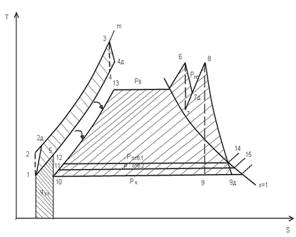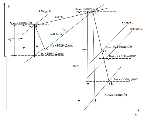 В цикле ПГУ применяется паровая турбина конденсационного типа с промежуточным перегревом пара, состоящая из части высокого и низкого давления (рис.1). Для определения параметров пара, необходимых в дальнейших расчетах, построим процесс расширения пара в турбине в h-S - диаграмме.