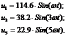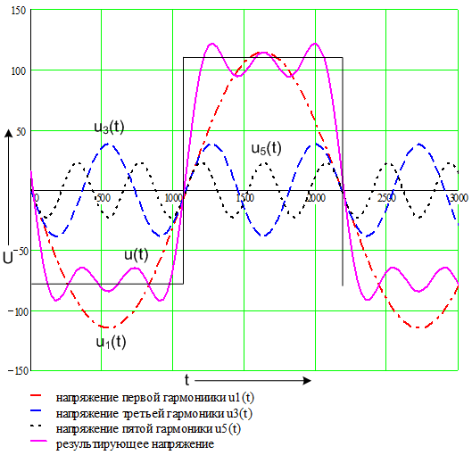 временные графики гармоник напряжения, суммарную кривую и заданное напряжение.