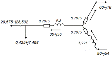 Рассматриваемая в проекте электростанция (ТЭЦ) выдаёт электроэнергию на трёх уровнях напряжений: генераторном, 35кВ, и в энергосистему по линии 110кВ. Все указанные напряжения меньше 220кВ, поэтому в расчётах электростанция может быть представлена приведённой мощностью на шинах ВН. Если за положительное принять направление мощности, генерируемой на станции, то распределение потоков мощности по обмоткам в эквивалентной упрощенной схеме замещения трансформаторов, установленных на ТЭЦ, соответствует представленному на рис. 4.5.