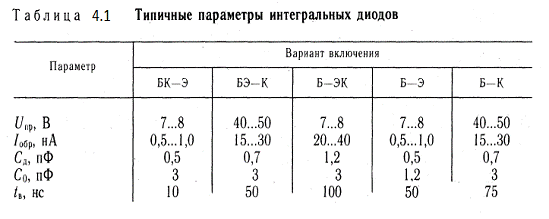 Стабилитроны. Полупроводниковым стабилитроном называют полупроводниковый диод с быстрым нарастанием обратного тока при пробое р-п перехода и нормированным значением пробивного напряжения. Основное назначение стабилитронов - стабилизация напряжения. Интегральные стабилитроны могут быть сформированы на базе структуры интегрального транзистора в различных вариантах в зависимости от необходимого напряжения и его температурного коэффициента. Обратное включение диода Б-Э используют для получения напряжения 5... 10 В с температурным коэффициентом +(2...5) мВ/°С. Диод работает в режиме лавинного пробоя. Обратное включение диода БЭ-К применяют для получения напряжения 3...5 В (явление прокола базы, температурная чувствительность -(2...3) мВ/°С). Один или несколько последовательно включенных в прямом направлении диодов БК-Э могут быть использованы как источники напряжения, равного напряжению на открытом переходе (около 0,7 В) или кратного ему. Их температурная чувствительность -2 мВ/°С. В температурно компенсированном стабилитроне, сформированном на основе базового и эмиттерного слоя, при подаче напряжения между n+ слоями один переход работает в режиме лавинного пробоя, второй - в режиме прямого смещения. Температурная чувствительность напряжения на этих двух переходах имеет противоположный знак, поэтому суммарная температурная чувствительность такого стабилитрона менее ±2 мВ/°С.
