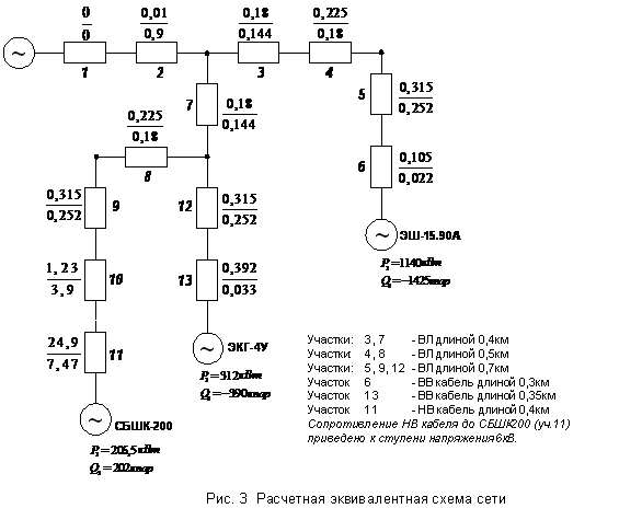 Для проверки сети составим эквивалентную схему сети (согласно схемы на рис.2), указав как активное так и реактивное сопротивление кабелей и линий электропередач, а так же сопротивление трансформаторов (рис.3).