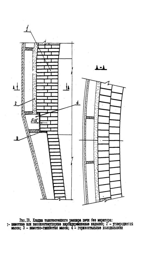 Между периферийными плитовыми холодильниками и кладкой распара, охлаждаемой части шахты, оставляют зазор 90-100мм, забиваемый измельченной (0-10мм) холодной углеродистой массой. Точно такая же конструкция футеровки выполняется и при охлаждении шахты комбинированными холодильниками, состоящими из вертикальных периферийных и горизонтальных холодильников.