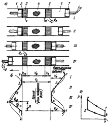 Рассмотрим рабочий цикл машины. Предположим, что в начале цикла компрессорный и детандерный поршни 7 и 1 находятся в крайнем правом положении (фаза I); в этом случае рабочее тело машины находится в основном в компрессорной полости 6, а также в блоке теплообменных аппаратов (рис. 2, а, б).