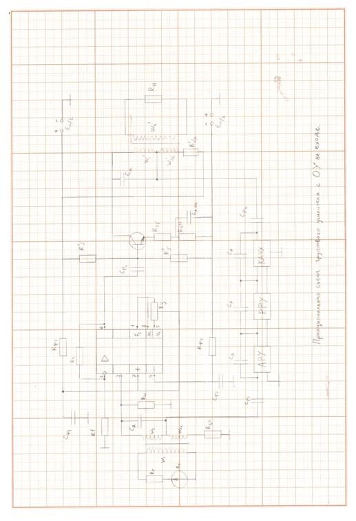 Связь усилителя с источником сигнала и нагрузкой осуществляется с помощью трансформаторов с дополнительными обмотками обратной связи: wос и w’ос. Особенностью схемы является применение общей комбинированной ООС. ОУ охвачен местной ООС (R1 и R2). Чтобы эти цепи ОС были отрицательными и взаимонезависимыми сигналы ОС подаются на разные входы ОУ: