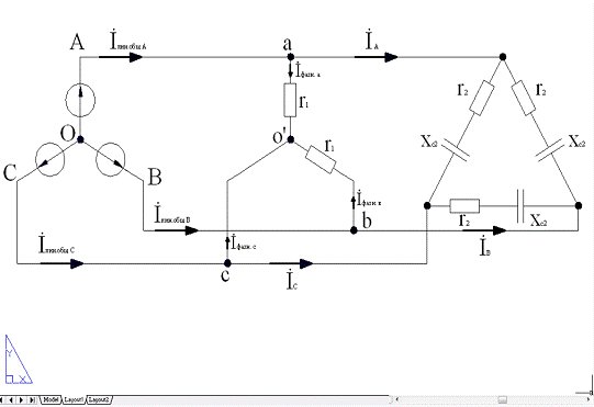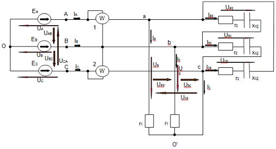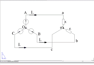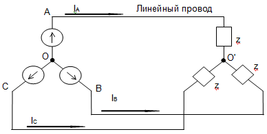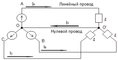 При соединении по схеме звезда-звезда точка, в которой объединены три конца трехфазной нагрузки называют нулевой точкой и обозначают О'. Нулевым проводом называют провод, соединяющий нулевые точки генератора и нагрузки. Ток протекающий по нулевому проводу называют нулевым током и обозначают . Положительное направление нулевого провода берется от точки О' к точке O. В моей схеме нулевой провод отсутствует.
