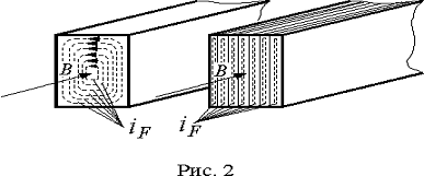 Протекающий по материалу сердечника электрический ток вызывает его нагрев. Если это тепло не используется, то говорят о потерях на вихревые токи. В соответствии с законом Джоуля-Ленца, мощность расходуемая на нагрев равна IF2r, где IF - действующее значение вихревых токов, а r - сопротивление контура, по которому они замыкаются. Очевидно, что эффективно снизить эти потери можно уменьшив ток. Это достигается увеличением удельного сопротивления материала и разделением его на отдельные изолированные друг от друга слои вдоль линий магнитного потока (рис. 2). Такое разделение на слои называется шихтованием магнитопровода.