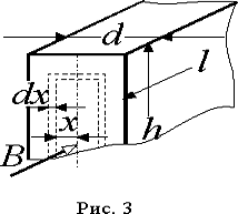 Пусть магнитопровод имеет форму параллелепипеда с длиной l, высотой h и толщиной d (рис. 3) и магнитный поток распространяется в направлении l. В плоскости перпендикулярной направлению вектора индукции B выделим элементарный замкнутый контур толщиной dx, стороны которого отстоят на расстоянии x от оси симметрии плоскости.
