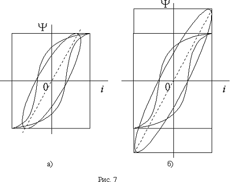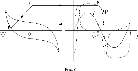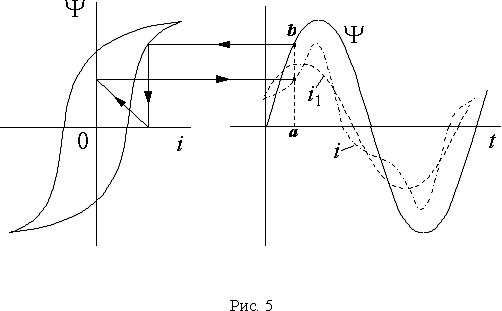 Полученная кривая i(t) имеет сильные искажения. В ее спектре резко выражена третья гармоника. Если выделить первую гармонику i1 (рис. 5) , то окажется, что синусоида потокосцепления отстает от нее на некоторый угол, называемый гистерезисным углом. Величина гистерезисного угла зависит от ширины петли гистерезиса, т.е. от потерь на перемагничивание. Если петлю гистерезиса заменить кривой намагничивания, то искажения кривой тока сохранятся, а гистерезисный угол будет равен нулю.