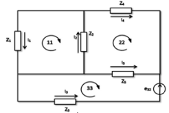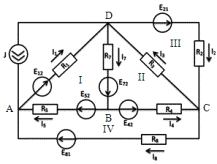 I) I11*(R1+R7+R5)-I22*R7-0-I44*R5=E12-E11+E72+E52) -I11*R7+I22*(R7+R3+R4)-I33*R3-I44*R4=-E72-E42