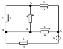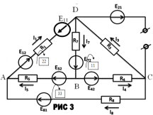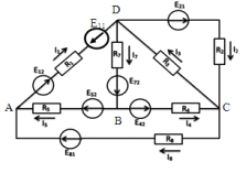 2. Составить системы уравнений для расчёта тока во всех ветвях схемы по законам Кирхгофа.