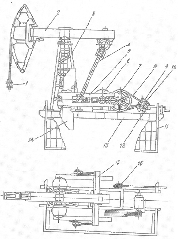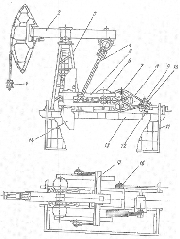 Электродвигатель через клиноременную передачу и редуктор придает двум массивным кривошипам, расположенным с двух сторон редуктора, круговое движение. Кривошипно-шатунный механизм в целом превращает круговое движение в возвратно-поступательное движение балансира, который качается на опорной оси. Балансир сообщает возвратно-поступательное движение штангам и через них плунжеру насоса.