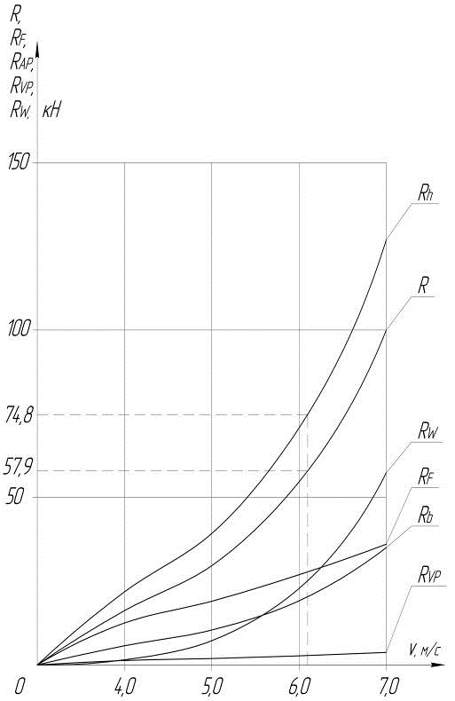 Для построения графиков сопротивления примем интервал скоростей от 4,0 м/с до 7,0 м/с, с шагом в 1,0 м/с.