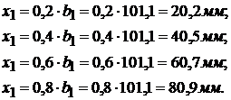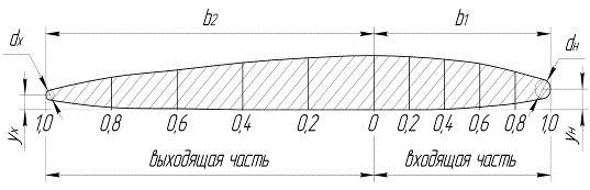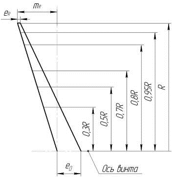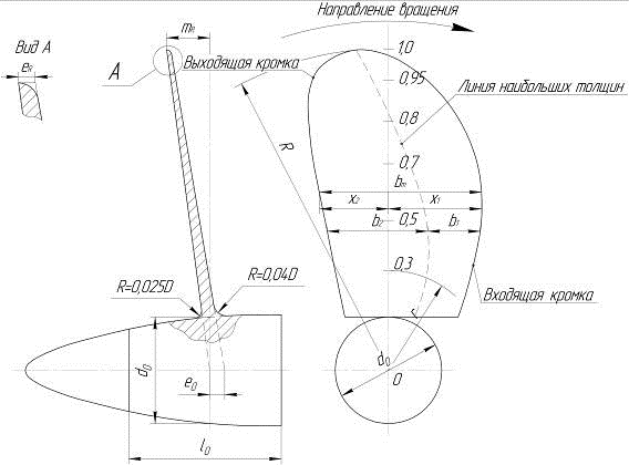относительных радиусах 0,3; 0,5; 0,7; 0,8; 0,95 и 1, строится контур лопасти