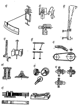 Кинематические пружинные устройства, к которым относят как непосредственно пружинные передаточные механизмы (рис. 2, в), так и упругие опоры (рис. 2, г), упругие направляющие (рис. 2, д) и гибкие связи (рис. 2, е). Достоинством этих элементов приборов является практически полное отсутствие трения при перемещениях механизмов, однако они могут использоваться лишь при ограниченных перемещениях.