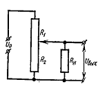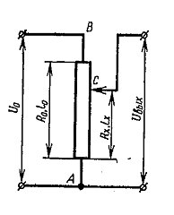 Электрическая схема потенциометра показана на рис. 3. Входное напряжение U0 подводится к точкам А и В потенциометра, а выходное Uвых снимается с точек А и С (скользящий контакт).