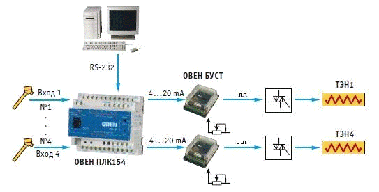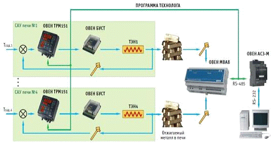 Отметим, что затраты на проведение модернизации существенно сократятся, если модернизация будет производиться на нескольких установках сразу. Например, для четырех печей кроме регуляторов температуры понадобится всего один модуль МВА8 и компьютер (рис. 1).