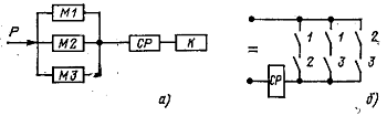 параллельном соединении релейных элементов (рис. 9,б) осуществляется