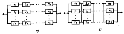 Для сопоставления эффективности общего и поэлементного резервирования сравним вероятности отказа двух систем, включающих одинаковое n(k+1) число равнонадежных элементов (рис. 12). В первом случае (рис. 12, а) осуществляется общее резервирование системы из п элементов кратностью k, во втором случае (рис. 1 2, б) при поэлементном резервировании каждый из п элементов системы имеет k резервных.