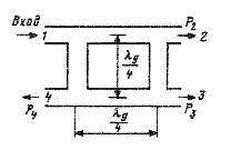 Выходные плечи ответвителя располагаются под углом 90° друг к другу. Можно показать, что при возбуждении плеча 1 сдвиг по фазе между волнами, поступившими во второе и третье плечи, равен 90°. Поэтому такие ответвители относятся к классу квадратурных.
