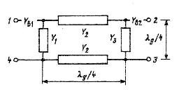 На рис. 6 параллельные проводимости Y1 и Y3 и последовательная проводимость Y2 нормированы к проводимости YВ2 линии, подключенной к плечу 1. Соответственно и проводимость YВ2 линии, подключаемой к выходным плечам, нормирована к проводимости YВ2. Можно показать, опираясь на эквивалентную схему (рис. 6), что идеальное согласование ответвителя достигается при