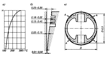 При работе двигателя температура потока горящей топливо-воздушной смеси, омывающей днище поршня, сильно меняется от минимальной при пуске и прогреве двигателя до максимальной на режимах наибольших нагрузок. При этом максимальную температуру имеет днище поршня, а минимальную - юбка. Распределение средней температуры при работающем двигателе по высоте поршня показано на рис. 2, а. С учетом такого распределения температуры профиль поршня по высоте выполняется одной из следующих форм: ступенчатой (рис. 2, б), конической или лекальной.
