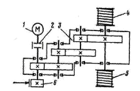 В корпусе редуктора на валах установлены две пары цилиндрических прямозубых шестерен, передающих крутящий момент от вала электродвигателя на барабаны и лебедки. Ведущий вал с шестерней получает вращение от вала электродвигателя через зубчатую муфту. На противоположный конец вала насажен на шпонке тормозной барабан. Шестерня передает вращение промежуточному валу через зубчатое колесо.