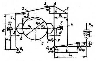 К тормозным колодкам для увеличения коэффициента трения приклепаны латунно-асбестовые обкладки. Сила нажатия колодок на тормозной барабан передается от груза через рычажную систему. Регулировка зазора между тормозным барабаном и колодками производится при помощи стяжной муфты и регулировочных винтов.