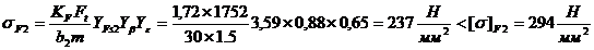 Д) Расчётные напряжения изгиба в основании ножки зуба: