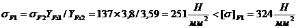 Б) По табл. принимается коэффициенты формы зуба и концентрации напряжений при коэффициенте смещения х=0; шестерни YFs1 = 3.8 колеса YFs2 = =3.59