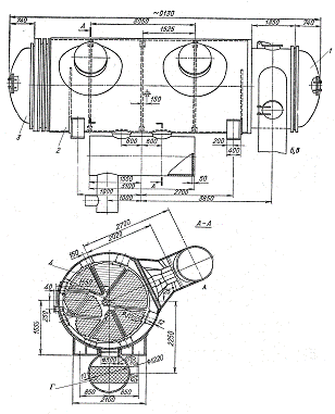 На рисунке 1 представлен подогреватель сетевой воды горизонтального типа ПСГ-2300-3-8-ІІ, т.е. этот тип подогревателя имеет площадь поверхности теплообмена 2300 м2, давление пара в паровом пространстве составляет 3 кгс/см2 (максимальное), а воды в трубах - 8 кгс/см2.