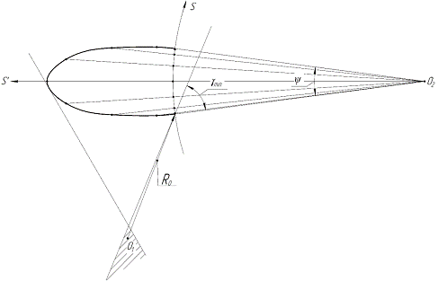 Проведем окружность радиусом Rmin = 90 мм. Окружность разделим на части, соответствующие делениям оси абсцисс диаграмм; направление деления и нумерация положений противоположны заданному направлению вращения кулачка. Через полученные деления проведем радиальные прямые. Каждая из прямых показывает текущее положение толкателя в обращенном движении. На прямых от точек деления, лежащих на окружности Rmin, отложим отрезки, равные ординатам диаграммы S для соответствующих положений. Через концы отрезков проводим линии под углом 90° к прямым, и огибающая этих линий является профилем кулачка.