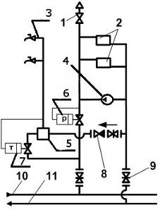 1 - воздушный кран; 2 - отопительный прибор; 3 - водоразборный кран; 4 - смесительный насос в системе отпления; 5 - смеситель в системе горячего водоснабжения; 6 и 7 - регуляторы расхода и температуры; 8 - обратный клапан; 9 - задвижка; 10 и 11 - подающий и обратный трубопроводы.