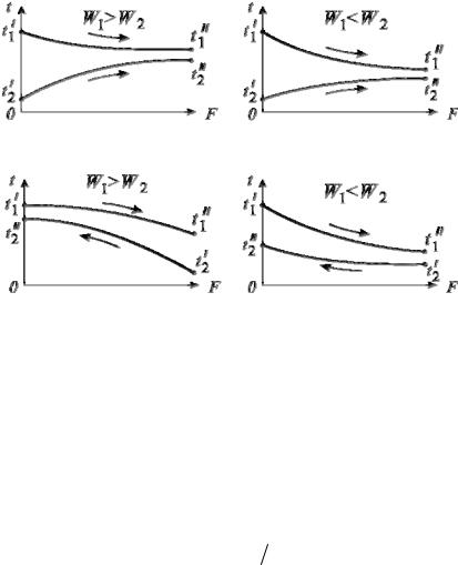 При различных соотношениях между водяными эквивалентами и в зависимости от схемы течения теплоносителей получают различные законы из-