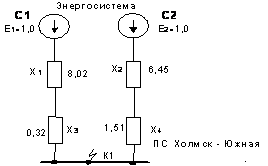 Ток КЗ, подтекающий от ПС Холмская - 0,624 кА;