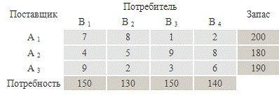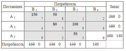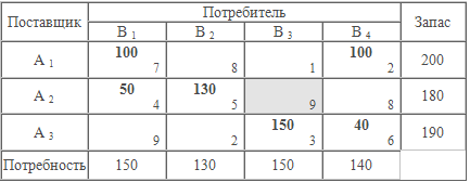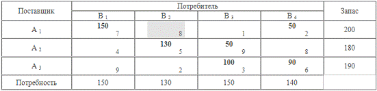 Будем использовать новый маршрут доставки продукции от поставщика A1 к потребителю B4. (ячейка A1B4)