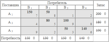 Мы израсходовали все запасы поставщиков и удовлетворили все потребности потребителей.