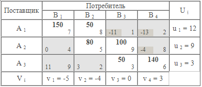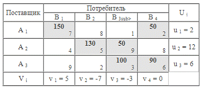 A1B4: v4 + u1 = 2, u1 = 2 - 0 = 23B4: v4 + u3 = 6, u3 = 6 - 0 = 61B1: v1 + u1 = 7, v1 = 7 - 2 = 53B3: v3 + u3 = 3, v3 = 3 - 6 = -32B3: v3 + u2 = 9, u2 = 9 - (-3) = 12